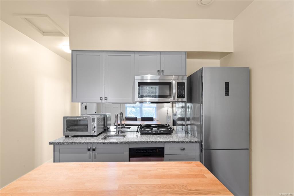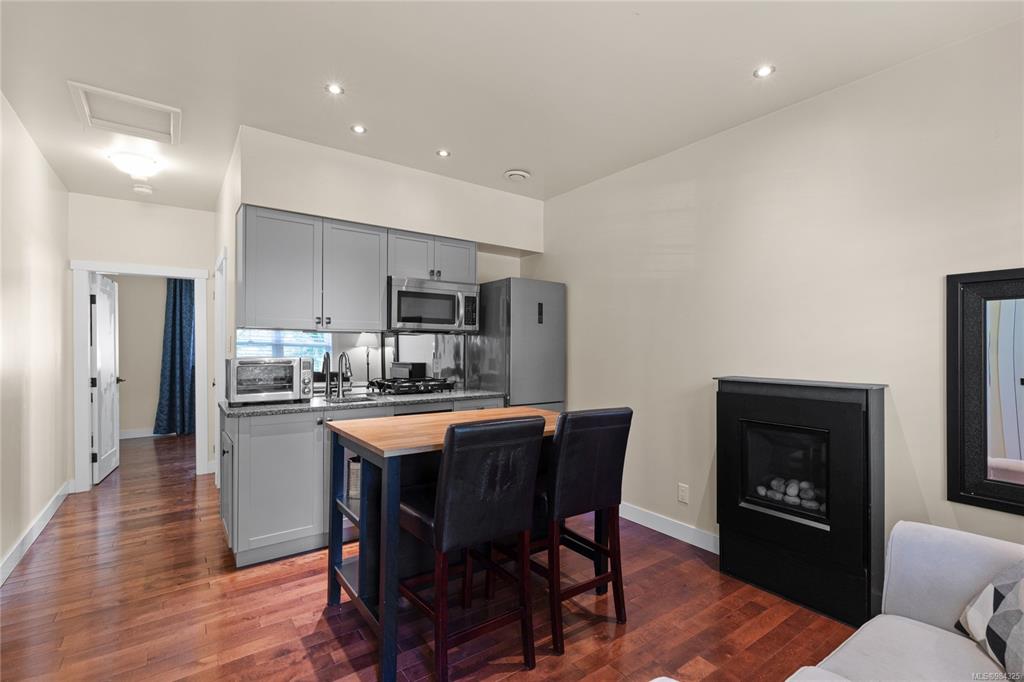 643 KENNEDY STREET SUITE #1: Unique cozy 1 BD, 1BA, main floor, ground level suite with private entrance off Kennedy Street; 15-min walk to/from Nanaimo downtown waterfront or The Old City Quarter. This fully updated & renovated heritage home offers a clean environment with no smoking/vaping inside your home, or on your private garden patio. All surrounding garden areas professionally maintained. Suite Includes washer & dryer, full closet, extra shelving and will accommodate up to a queen size bed. Also includes full bath & tiled shower & linen closet. Electric baseboard heaters plus heated bathroom floor & a gas fireplace in the living area. Optional: private off-street designated parking space; selected furnishings of desk & chair, sofa love-seat, moveable island high table with extra kitchen storage & bar stools; secure extra private storage for bikes etc. $1,600 – $1,750 (depending on items selected) plus utilities Available Now!